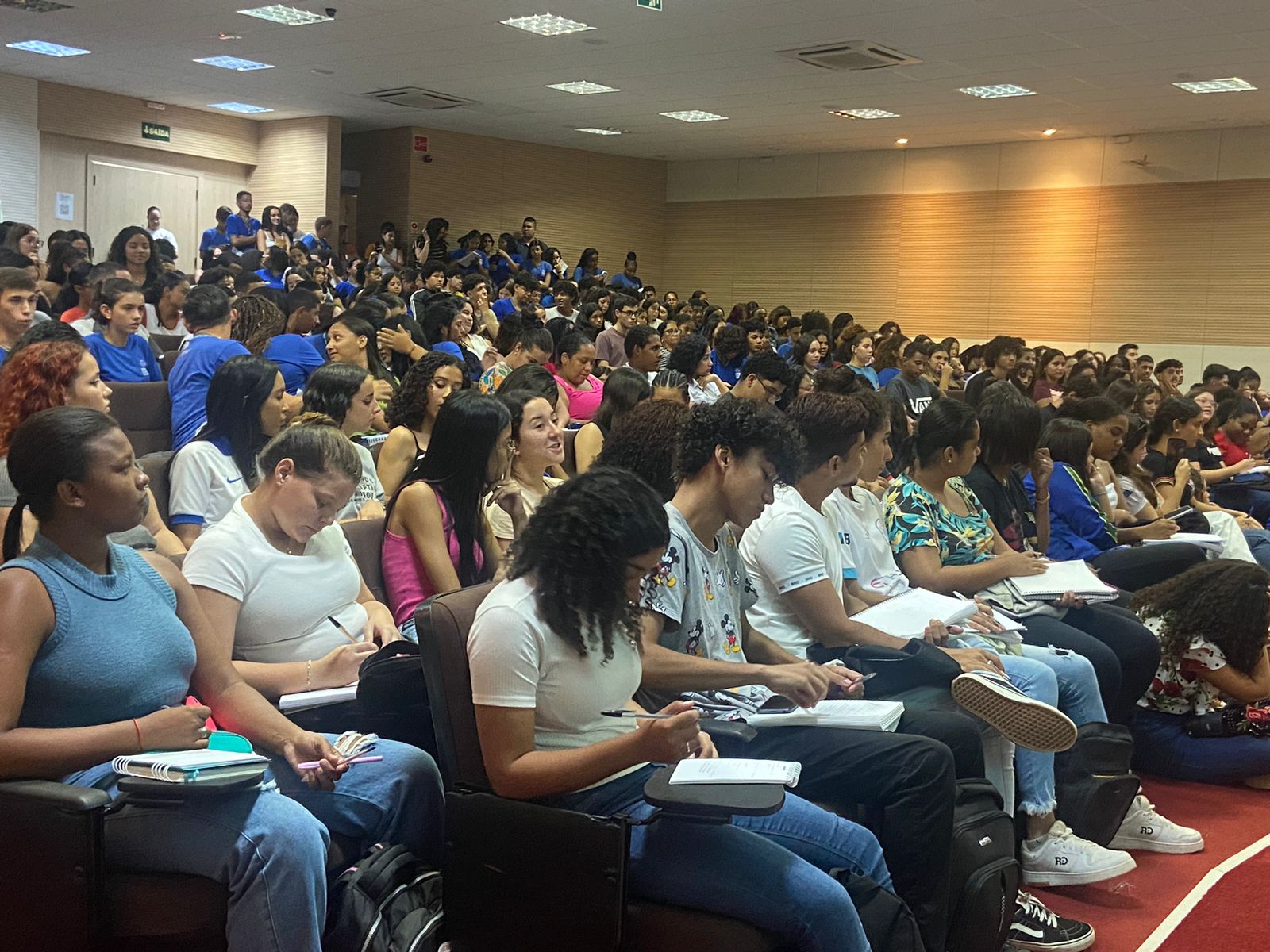 A Seduc deu o pontapé inicial no Pré-Enem Digit@l 2024, no dia 23 de março, no teatro da Universidade Federal de Mato Grosso (UFMT), com a presença de mais de 400 estudantes da Rede Estadual de Ensino. Na oportunidade, foi entregue para cada estudante o kit de material de estudo com 12 livros e quatro cadernos contendo exercícios e simulados.