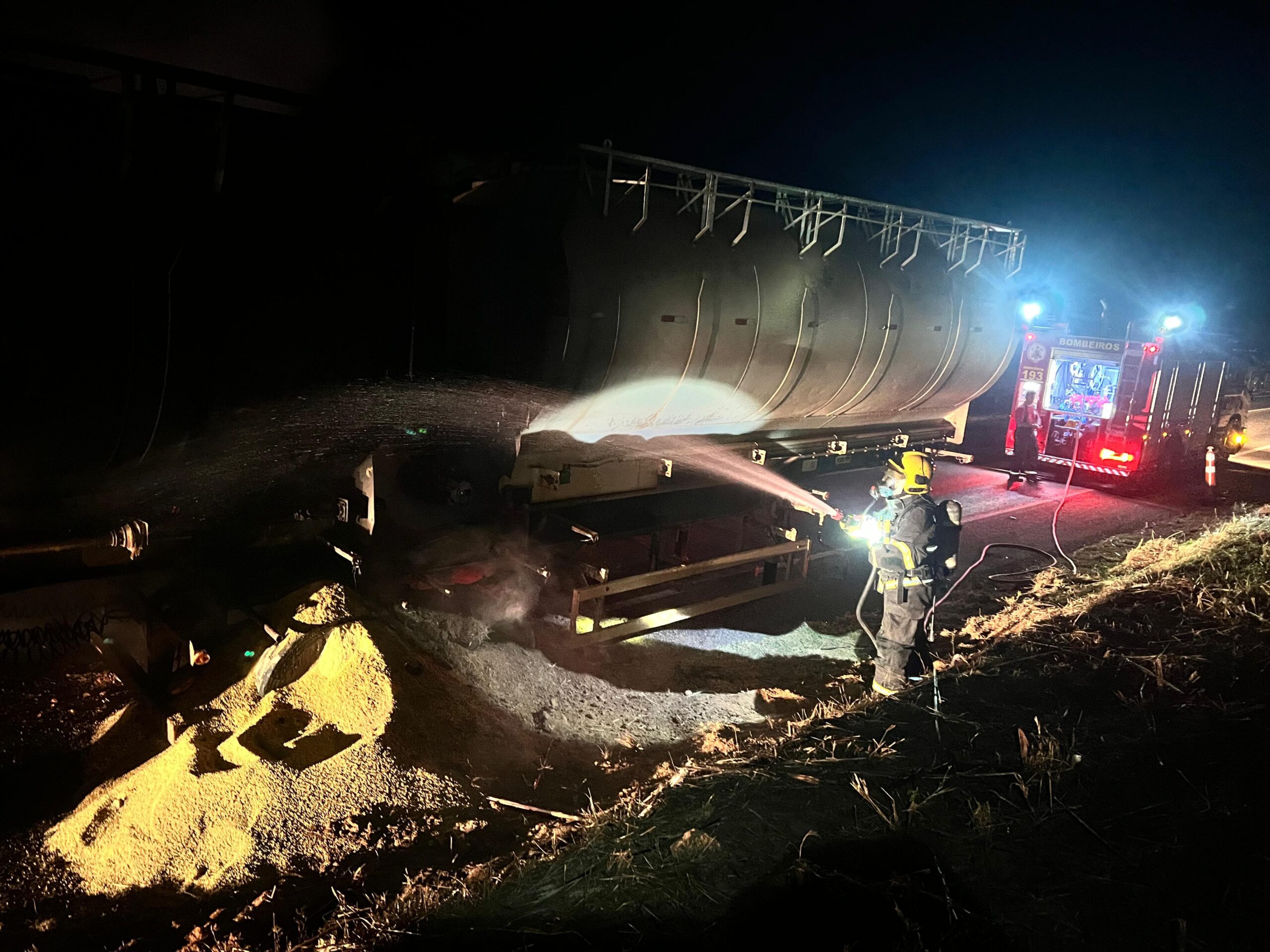 Corpo de Bombeiros realiza rescaldo em caminhão carregado com ração para suínos