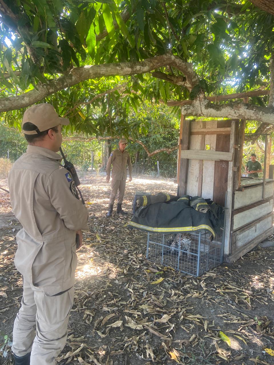 Os moradores haviam capturado a jaguatirica.Com os devidos cuidados, a equipe da 12ª Companhia Independente Bombeiro Militar (12ª CIBM) colocou o felino em uma jaula de transporte para garantir sua segurança.