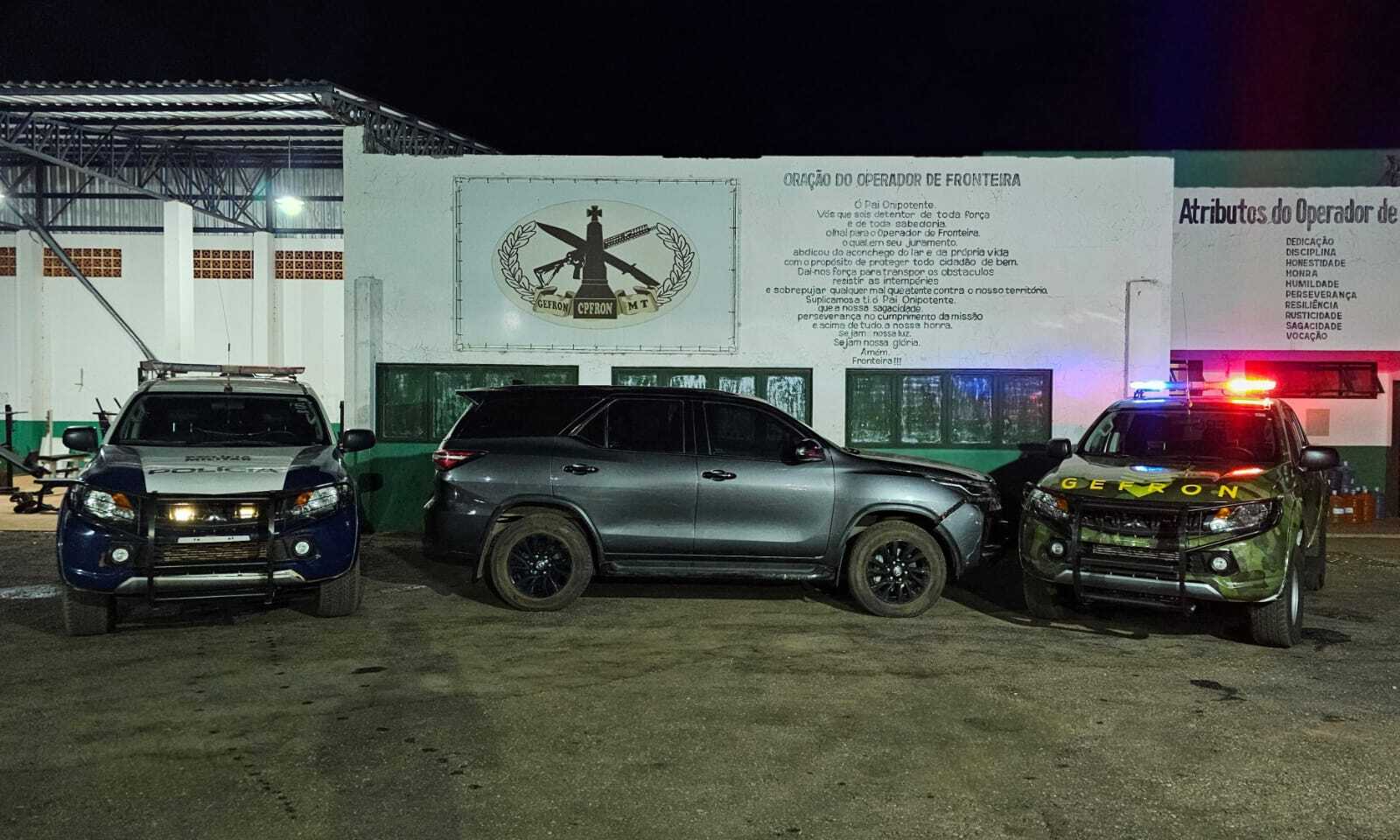 Dois homens, de 31 e 18 anos, foram presos em flagrante na madrugada desta quarta-feira (31.07),  no município de Porto Esperidião (326 km de Cuiabá), tentando seguir para a fronteira com a Bolívia levando uma caminhonete Hillux SW4 roubada sobre um caminhão guincho.
