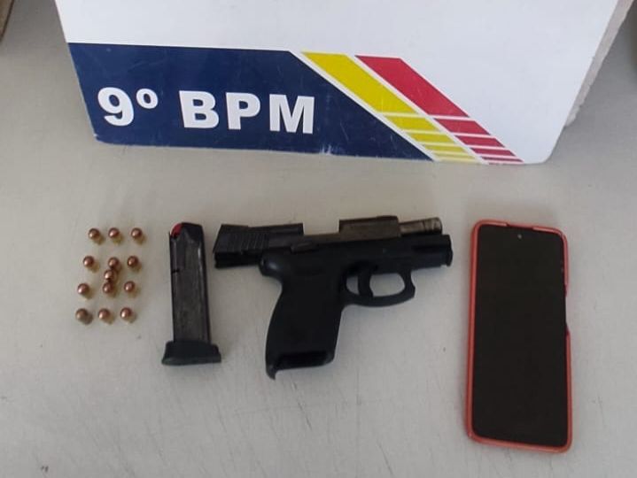 Em depoimento aos militares, o criminoso também informou possuir uma arma de fogo dentro da casa. Os policiais realizaram buscas no imóvel e localizaram uma pistola de calibre 380 carregada com 13 munições, que estava escondida dentro de uma caixa de descarga.