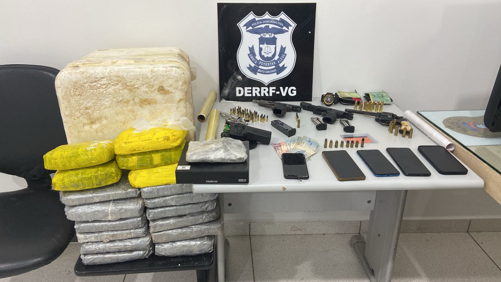 Dois criminosos, envolvidos com tráfico de drogas e posse ilegal de arma de fogo e munições, foram presos em flagrante pela Polícia Civil, na tarde de segunda-feira (11.11), durante diligências realizadas pelos policiais da Delegacia Especializada de Roubos e Furtos de Várzea Grande (Derf-VG). A ação resultou na apreensão de 18 tabletes de entorpecentes, quatro armas de fogo e dezenas de munições.