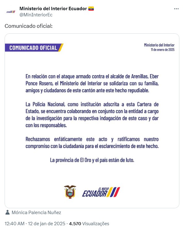 Ministério do Interior do Equador lamenta morte do prefeito de Arenillas.