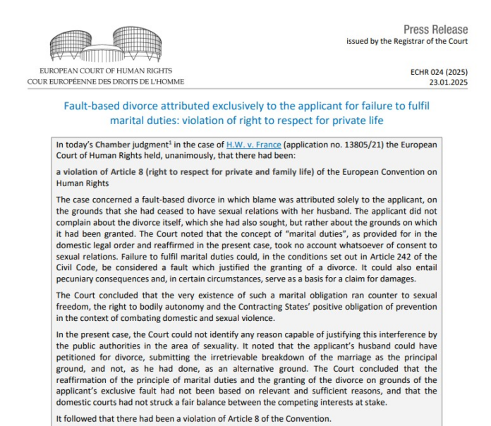 Tribunal decidiu, nesta quinta (23), que a Justiça da França violou o direito de H.W., de 69 anos, ao respeito pela vida privada e familiar. Francesa espera que decisão ajude a mudar leis e marque ‘reviravolta na luta pelos direitos das mulheres’.