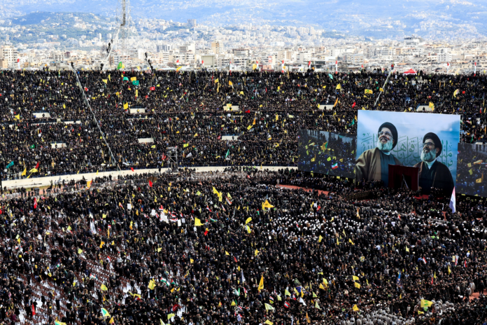 Um caminhão que transportava os caixões de Nasrallah e de seu sucessor, Hashem Safieddine, mortos sucessivamente em ataques israelenses, deu a volta ao estádio.