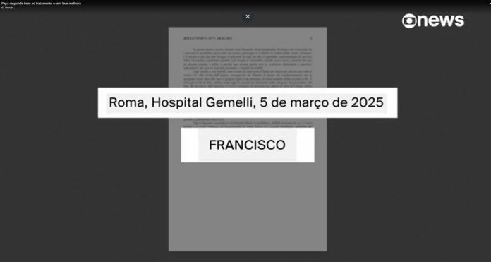 Francisco está realizando fisioterapia respiratória e recebe oxigênio de alto fluxo no hospital Gemelli. Em alguns dias, após crises agudas, ele também respirou com o auxílio de uma máscara, de forma não invasiva, segundo os boletins médicos divulgados pela Santa Sé.
