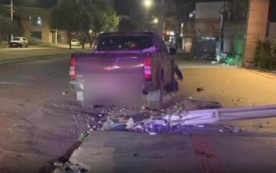 Uma câmera de segurança registrou o momento em que a caminhonete entra na via e na sequência bate contra contra o poste. Com o impacto, o poste foi cai e os fios de energia arrebentam.