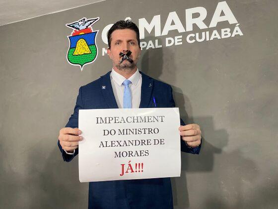 Com a boca vendada, ele exibiu para os jornalistas uma placa com a inscrição “Impeachment do ministro Alexandre de Moraes Já!” e o acusou de ser um ditador. O vereador também apresentou uma moção de repúdio contra o ministro do Supremo, que foi aprovada pelos em plenário, e cobrou que os senadores assinassem o pedido.