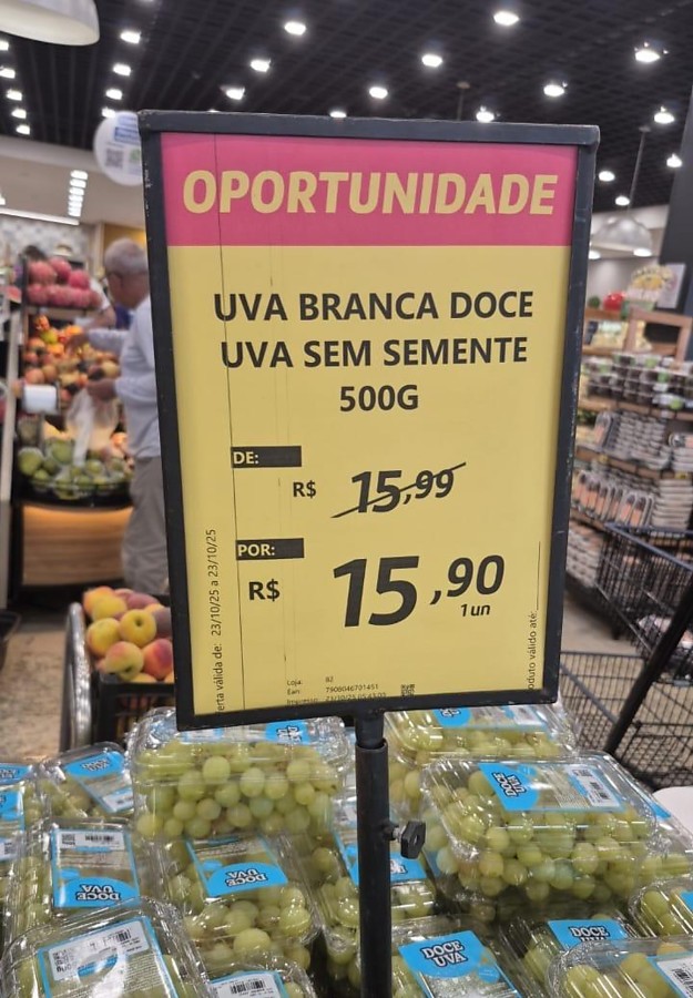 A plaquinha diz: Oportunidade, uva branca doce e uva sem semente 500g de R$ 15,99 por R$ 15,90. Sem dúvida, graaaande oportunidade SQN.
