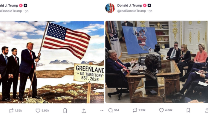 Na montagem, Trump aparece em uma paisagem ártica segurando a bandeira dos EUA acompanhado por seu vice, J.D. Vance, e o secretário de Estado, Marco Rubio. Perto deles, uma placa diz “Groenlândia: território dos EUA estabelecido em 2026”. (Veja na imagem abaixo)