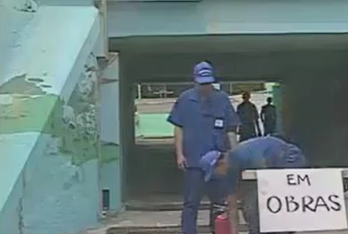 O trecho mostra dois atores vestidos de funcionários de manutenção. Um deles, munido de um extintor de incêndio, se esconde em um bueiro, com a ajuda de um colega, no passeio público.