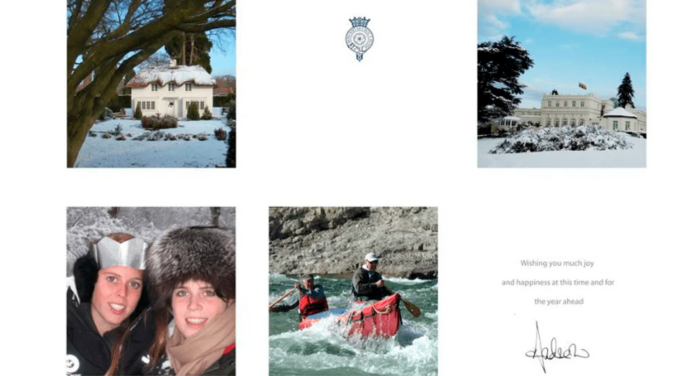 O cartão de 2011 apresentava uma foto das irmãs juntas, ao lado de uma foto de Andrew navegando e imagens de suas residências reais cobertas de neve.