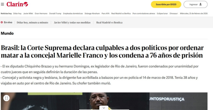 O jornal argentino dá destaque ao voto da ministra Cármen Lúcia, segundo o qual “Chiquinho Brazão, ex-deputado federal, e seu irmão Domingos Brazão, conselheiro do Tribunal de Contas do Rio, ‘lideraram’ uma organização armada criminosa dedicada à ocupação e exploração ilegal de terras em comunidades pobres da zona oeste do Rio”.