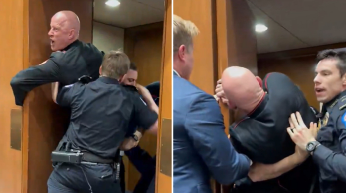 Em publicação no X, o senador Sheehy afirmou que o manifestante estava “descontrolado” e que decidiu “ajudar e apaziguar a situação”.