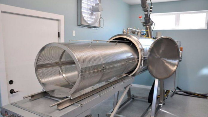 O corpo é colocado em um cilindro metálico numa máquina onde será cozido em alta temperatura em uma mistura de água e uma substância alcalina, como o hidróxido de potássio — composto químico muito semelhante à água sanitária. A temperatura varia entre 90 ºC e 150 ºC, mas como o cilindro fica sob muita pressão, a água não chega a ferver.