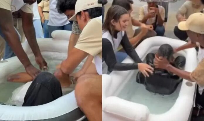 O batismo foi realizado em uma banheira inflável instalada na calçada próxima à avenida. A cerimônia foi conduzida pelo evangelista Allan Machado, que liderava a equipe responsável pela evangelização, mesmo sob chuva.