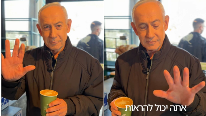 No vídeo, Netanyahu aparece pedindo um café enquanto conversa com a pessoa que está filmando.