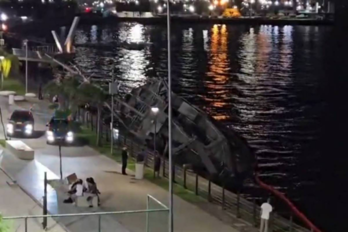 O tombamento do navio inativo ocorreu na noite de sexta-feira (13), devido ao acúmulo de água em seu interior. Metade da embarcação ficou submersa e é vigiada pela Guarda Portuária. Ninguém ficou ferido.
