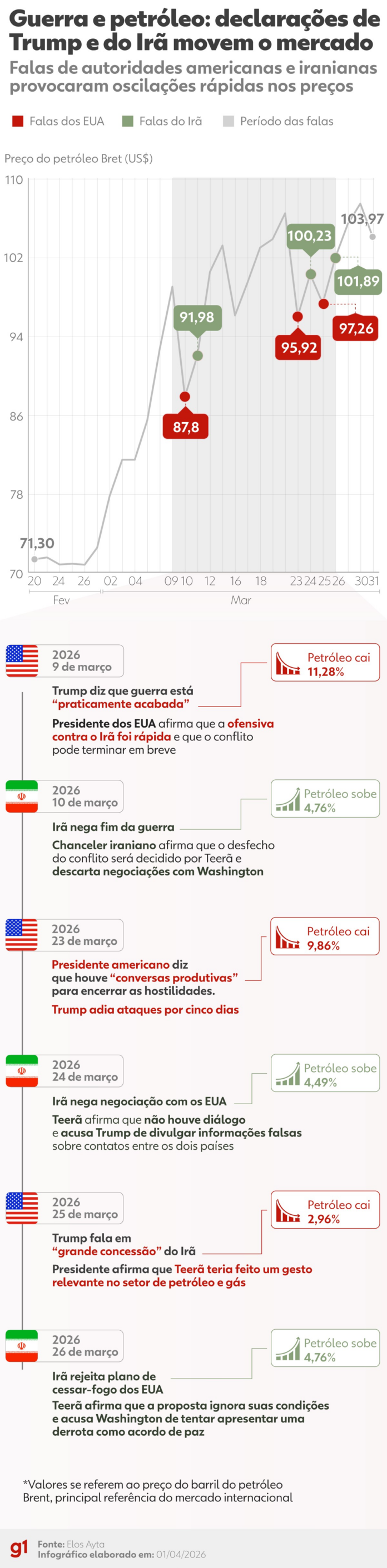 Quando surgem declarações que indicam negociações, possíveis tréguas ou mediação internacional, a tensão dos investidores diminui e, com isso, o temor de problemas no transporte de petróleo também recua, explica Gustavo Sung, economista-chefe da Suno Research.