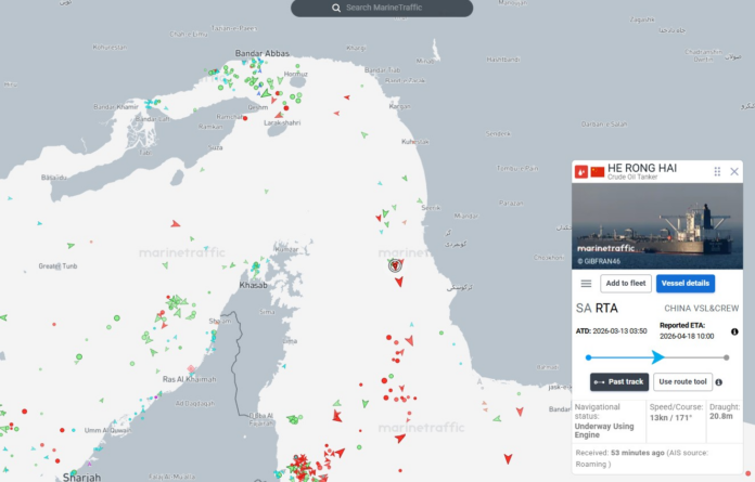 Posição do navio He Rong Hai após passar pelo Estreito de Ormuz.