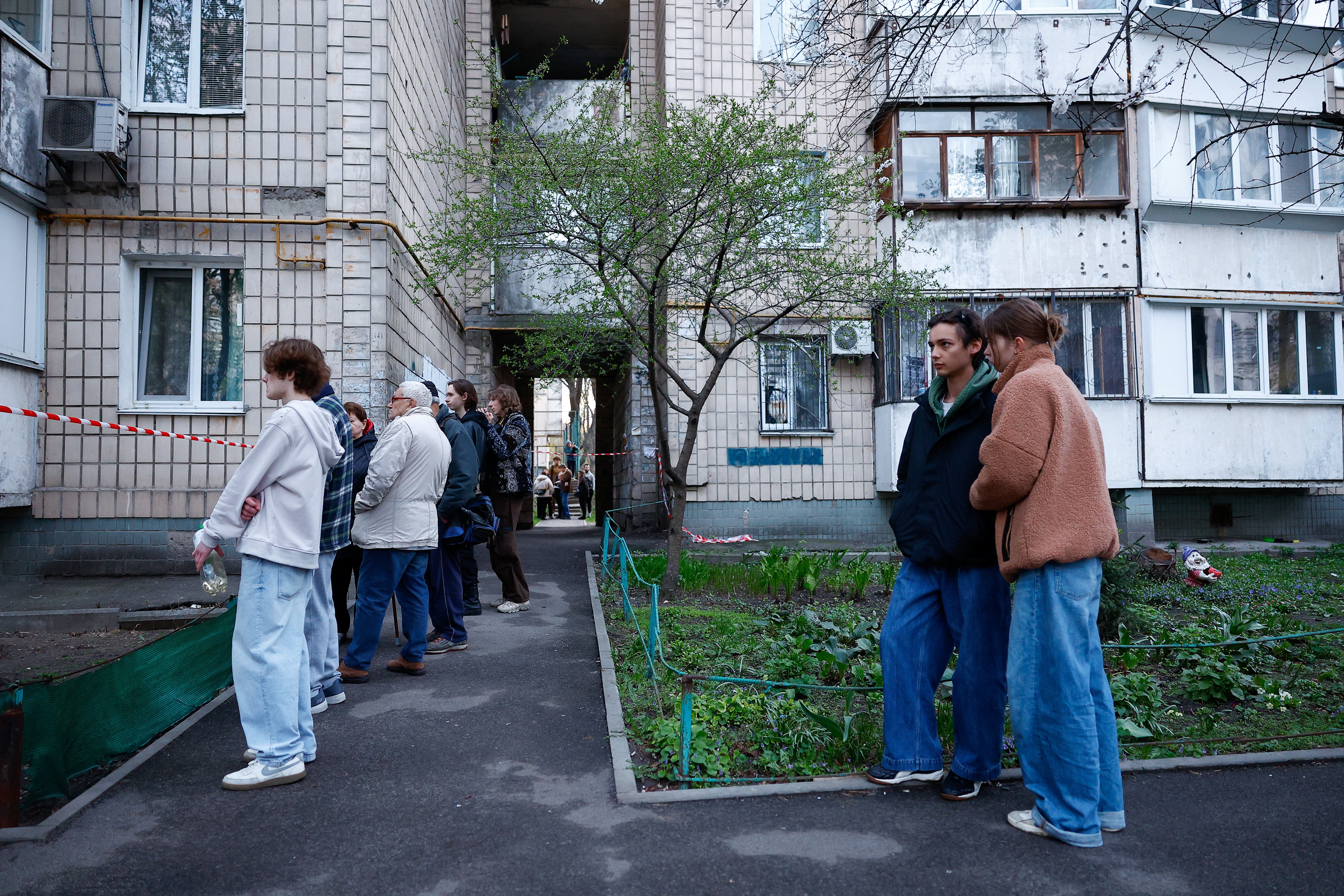 Moradores observam o local de um tiroteio em Kiev , Ucrânia, em 18 de abril de 2026.