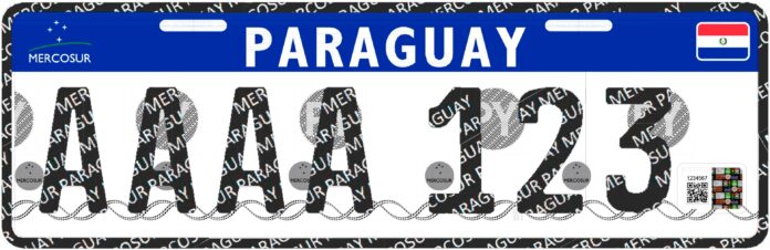 O Paraguai também adota o padrão visual comum: fundo branco, faixa azul superior com emblema do bloco no lado esquerdo e a bandeira do país no lado direito com o nome Paraguay centralizado acrescentando um QR Code para consulta de informações do veículo.