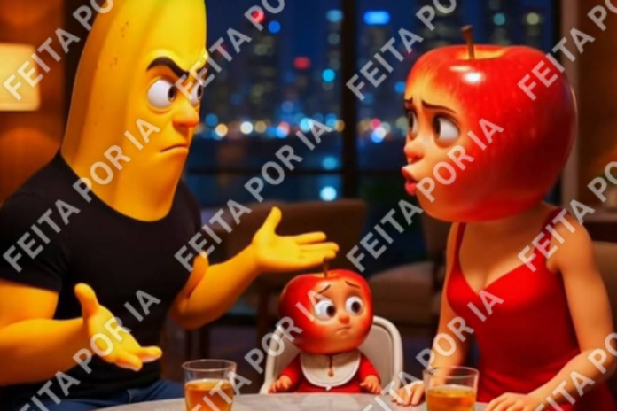 É digitando comandos assim em plataformas de inteligência artificial que criadores de conteúdo têm gerado as chamadas “novelinhas das frutas“, melodramas de menos de um minuto em que alimentos assumem a forma humana para protagonizar situações como a descrita acima.