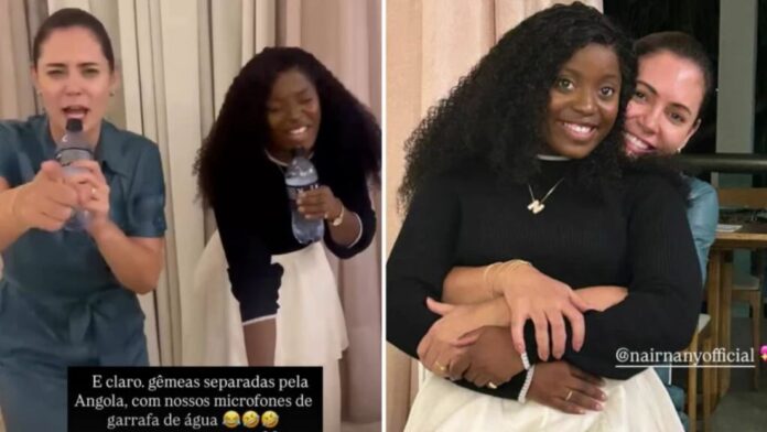 Michelle Bolsonaro aparece ao lado da cantora angolana Nair Nany, a quem se referiu como “preciosa” na publicação. “Gêmeas separadas pela Angola, com nossos microfones de garrafa de água. Deixa a Cassi ver isso”, escreveu, referindo-se a Cassiane, artista que deu voz à canção originalmente em 2001 no álbum “Recompensa”, lançado pela MK Music.