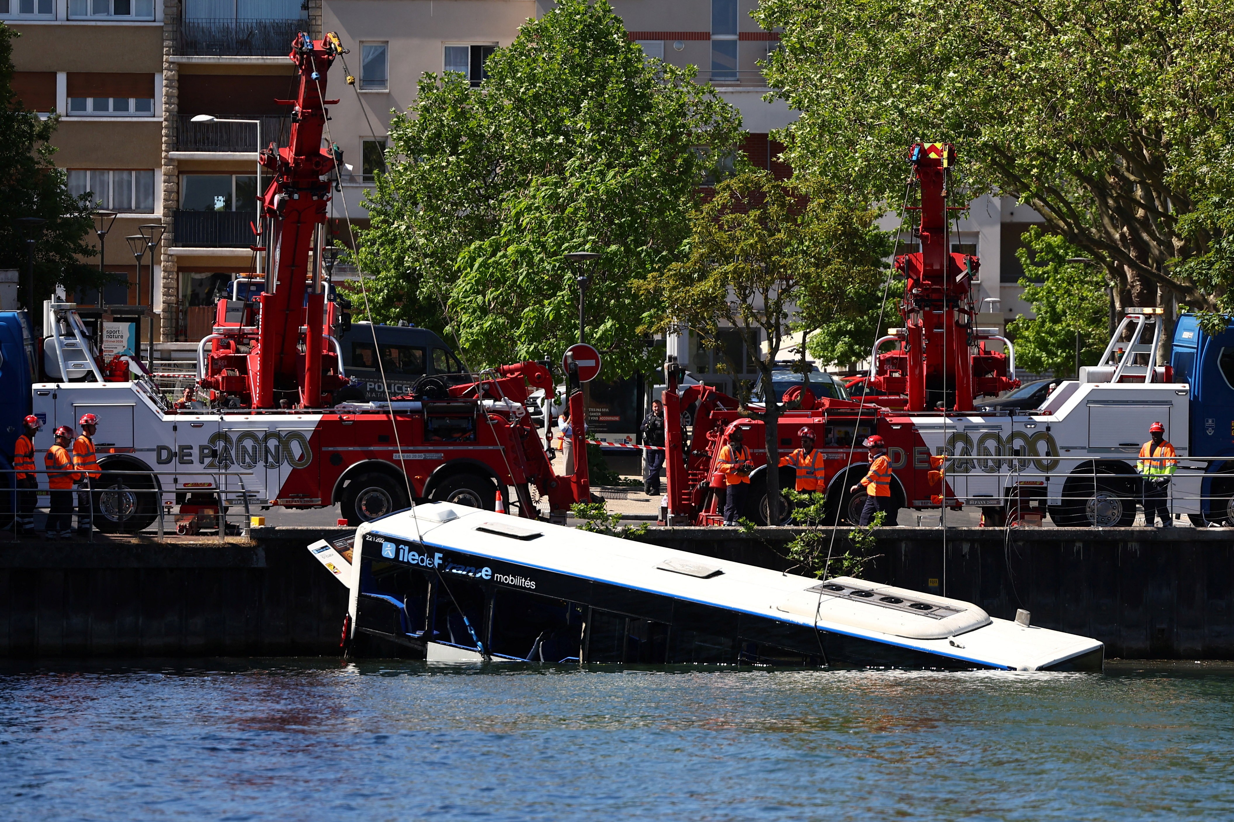 Ônibus que caiu no rio Sena, perto de Paris, na França, é içado por equipes de resgate, em 30 de abril de 2026.